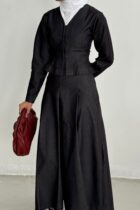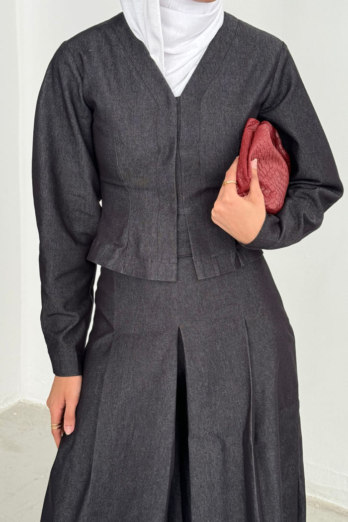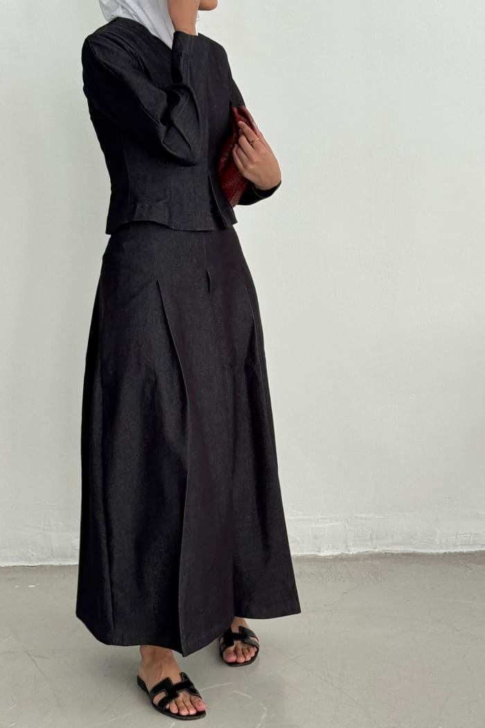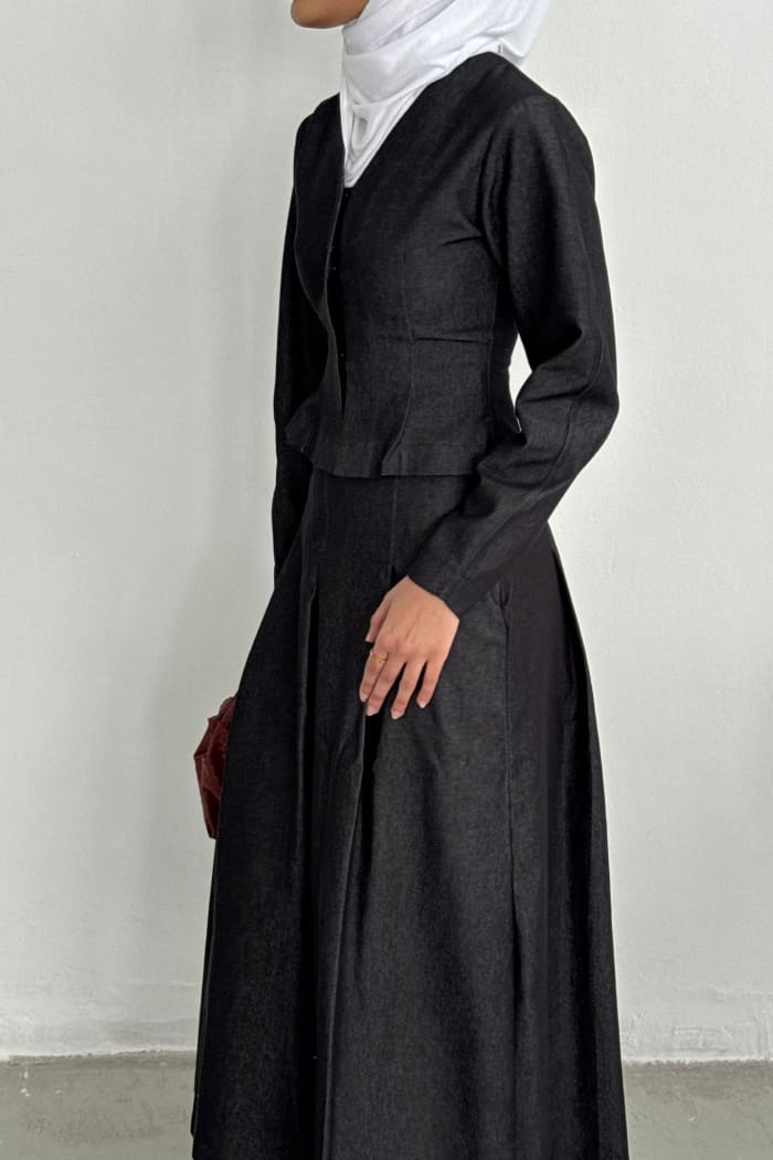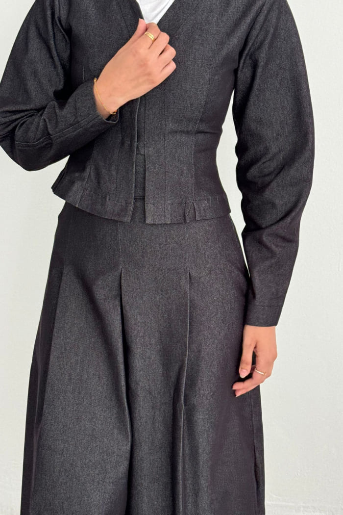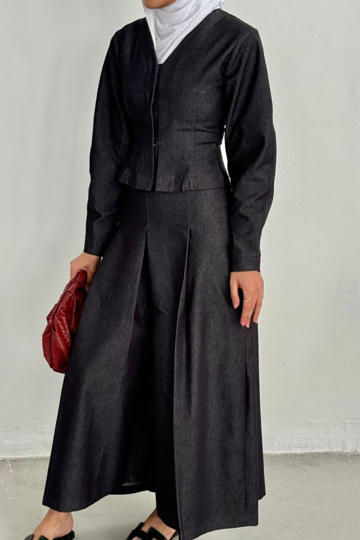 The Black Denim Amena Set brings together a stylish jacket and high-waist pants for a trendy yet practical look. Ideal for any occasion, this set blends comfort with classic denim appeal.