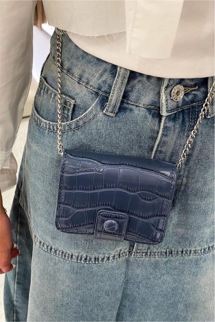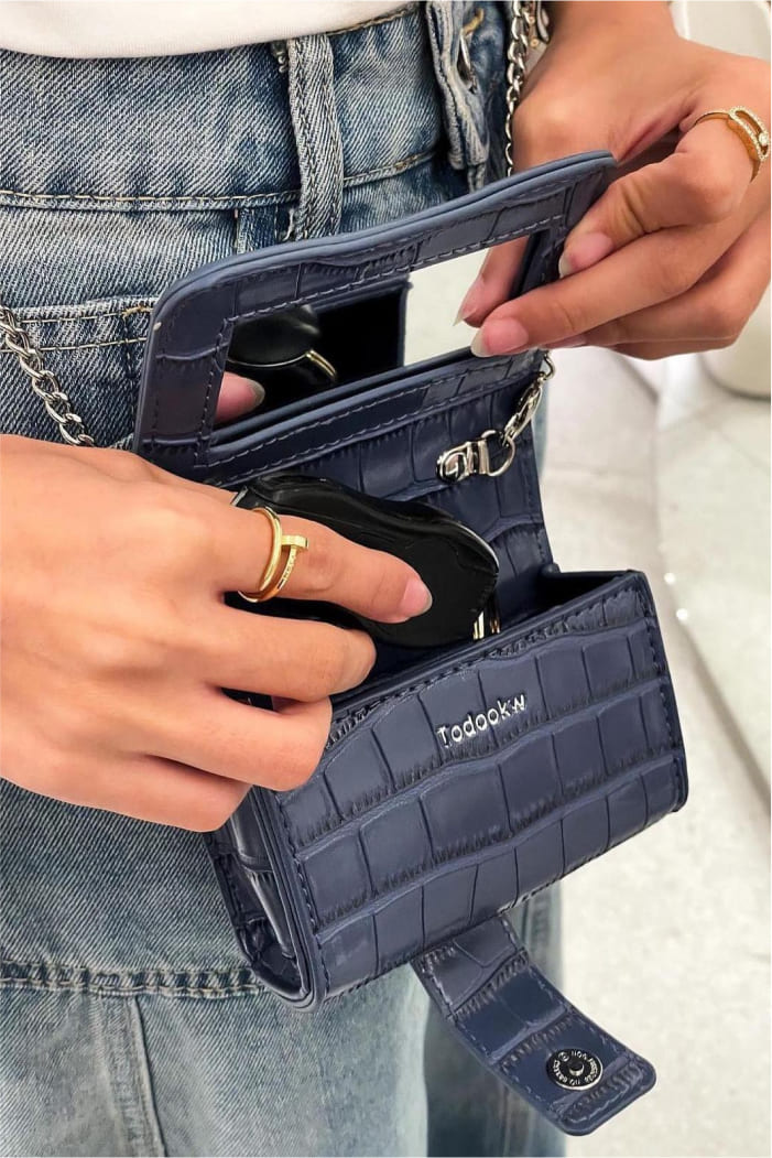 A mini blue bag adds a vibrant pop of color and a touch of sophistication to any outfit. Its compact design makes it perfect for carrying essentials while making a stylish statement.