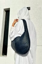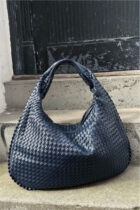 A textured blue leather bag adds a bold and sophisticated touch with its rich, tactile surface. Its unique color and durable material make it a standout accessory for any ensemble.
